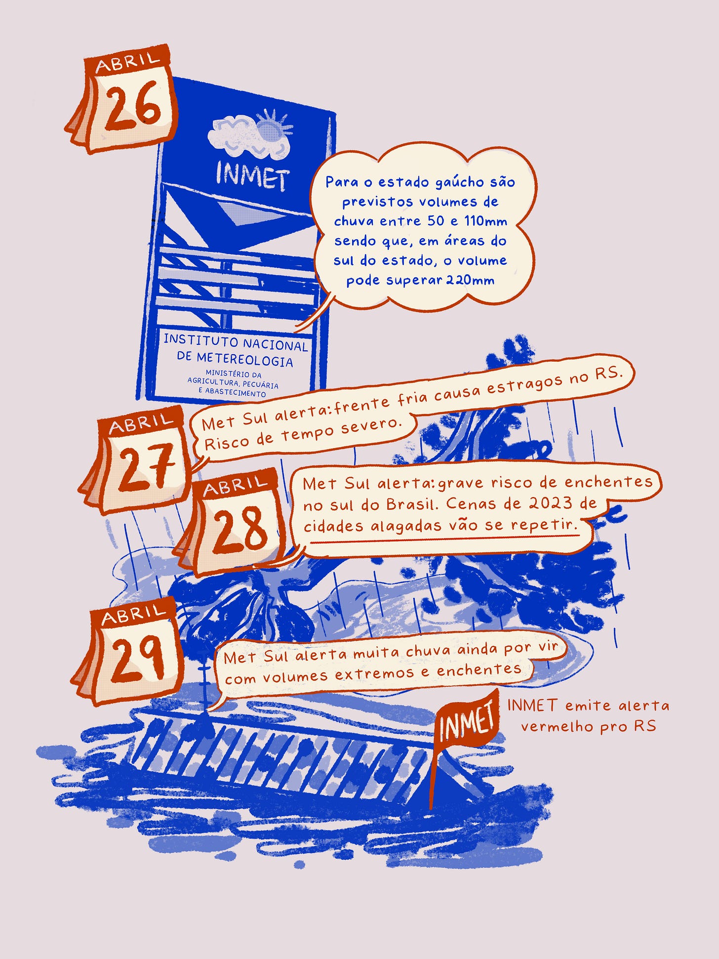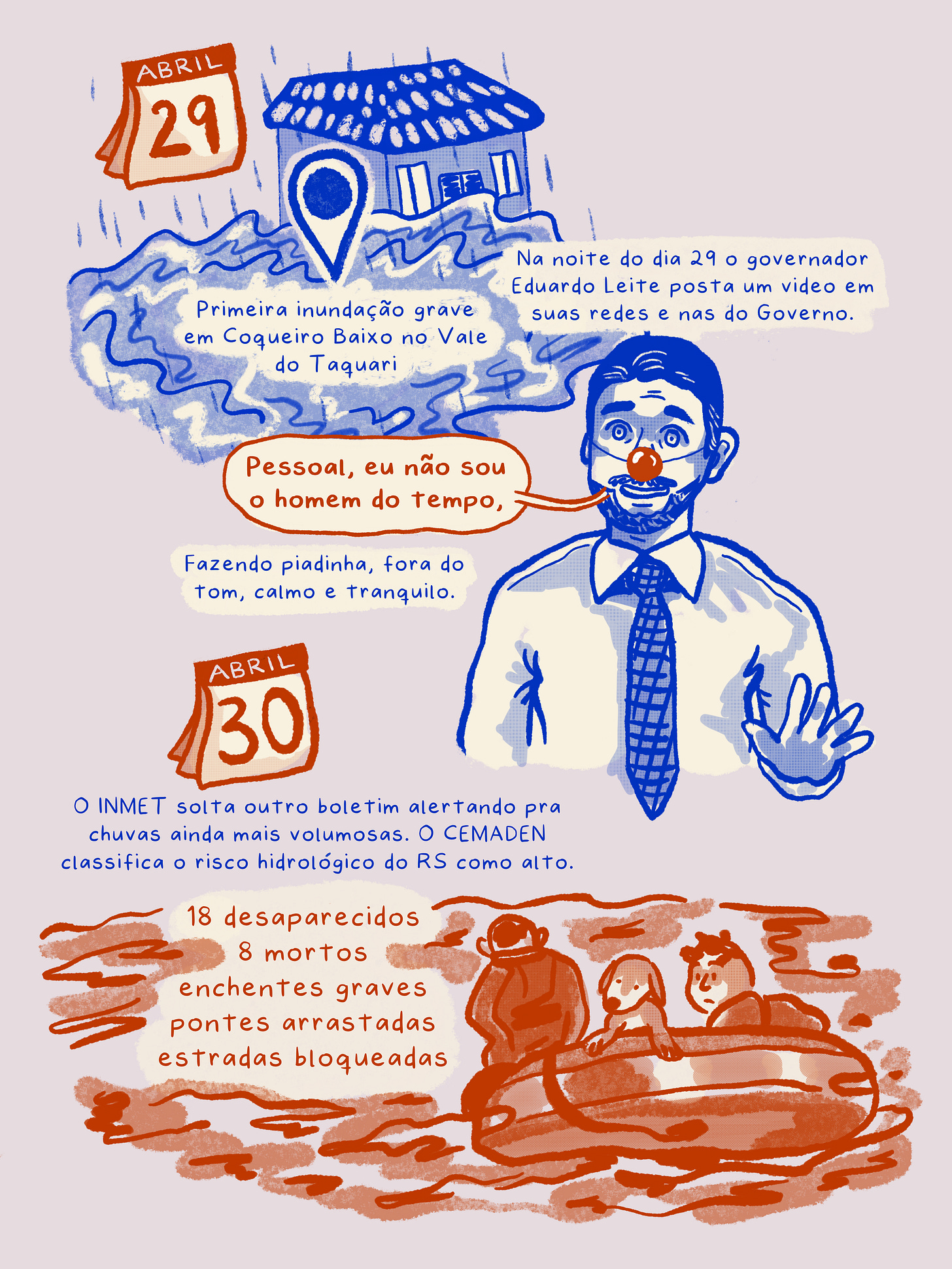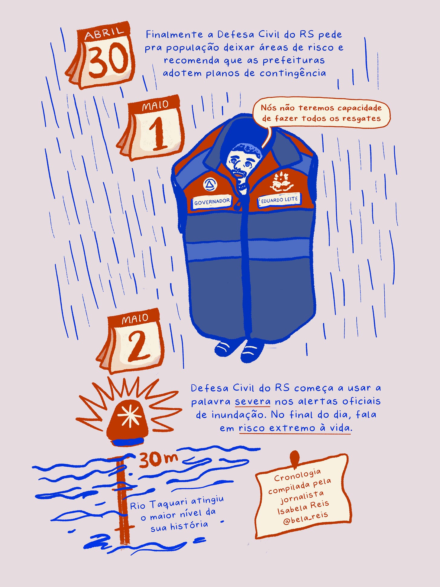Ontem parei um pouquinho de escrever, abri essa thread da Isabela Reis que lista os vários alertas metereológicos avisando de riscos de enchentes que o Governo do RS, o Governador Eduardo Leite e a própria Defesa Civil-RS ignoraram e negligenciaram. Resolvi ilustrar bem rapidinho: